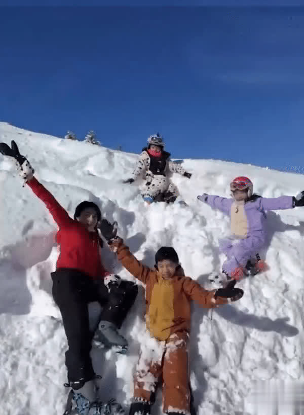 郭晶晶与三儿子一起躺在雪上,每个人都张开手臂扬起雪花,画面写满欢乐与幸福。而这张温馨全家福背后的摄影师,除了霍启刚应该找不出第二人了。