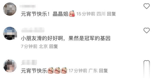看完郭晶晶发的视频后,网友在送上“元宵节快乐” 节日祝福的同时,还大赞小朋友们滑的好好,称:“果然是冠军基因”。